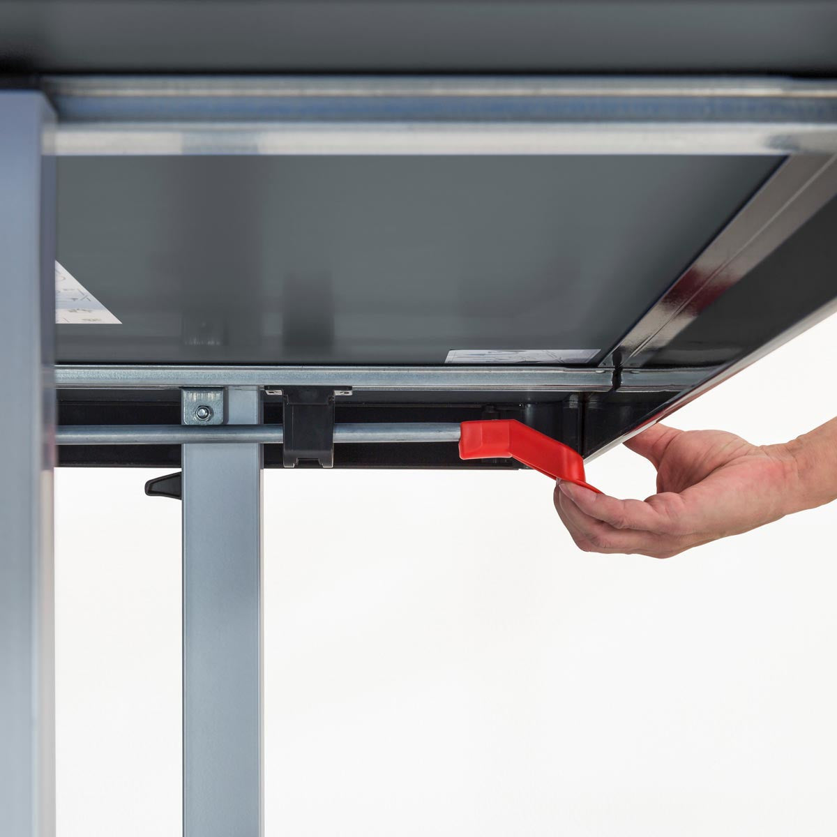 • trekstang onder het tafelblad ontgrendelt beide veiligheidsvoorzieningen tegelijkertijd