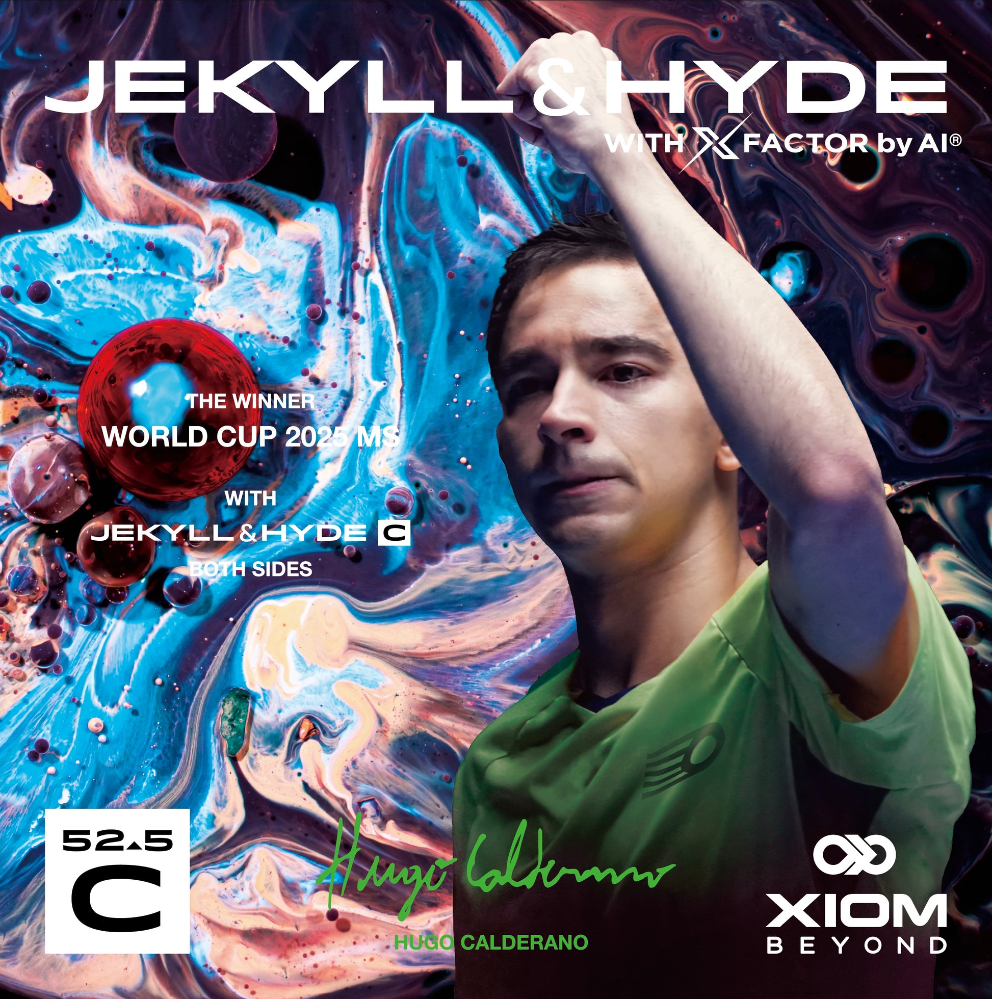 De Jekyll & Hyde C52.5, Hugo Calderano's keuze voor zowel forehand als backhand, is het eerste rubber met 'X-FACTOR', de prestaties die voorheen alleen mogelijk waren door booster toe te passen. Deze innovatie is het resultaat van jarenlange experimenten met behulp van kunstmatige intelligentie, wat heeft geleid tot de ontwikkeling van de Epsilon Sponge.