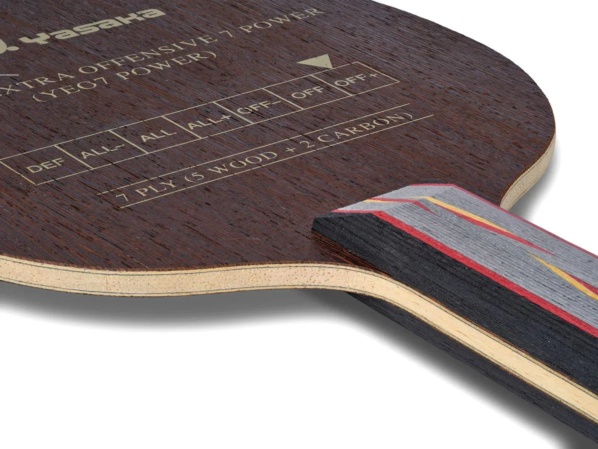 De laatste jaren is Yasakas EXTRA OFFENSIVE een groot succes gebleken, gewaardeerd door de spelers All over de hele wereld. Met ervaring van het beroemde EXTRA OFFENSIVE mes Yasaka heeft een nieuw lemmet ontwikkeld, speciaal voor spelers die op zoek zijn naar een superieur aanvalswapen. De zeer harde buitenlaag wordt gecombineerd met een medium harde tweede laag en een dunne en zeer lichte laag CarbonHet middelste fineer wordt geselecteerd en afgewerkt met een perfecte hardheid en dikte. Het lijm- en persproces is ontwikkeld om de balans tussen snelheid en controle te verbeteren.
