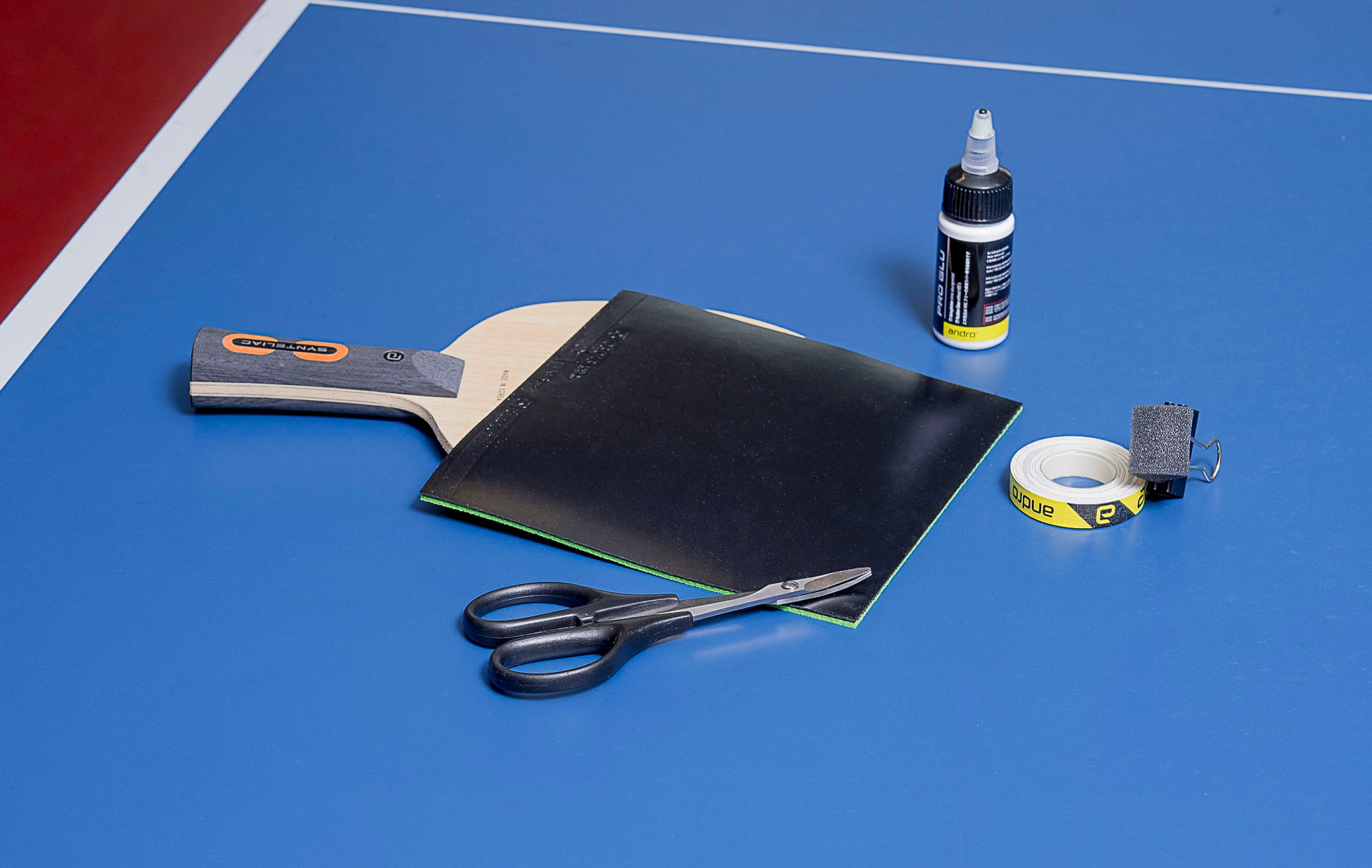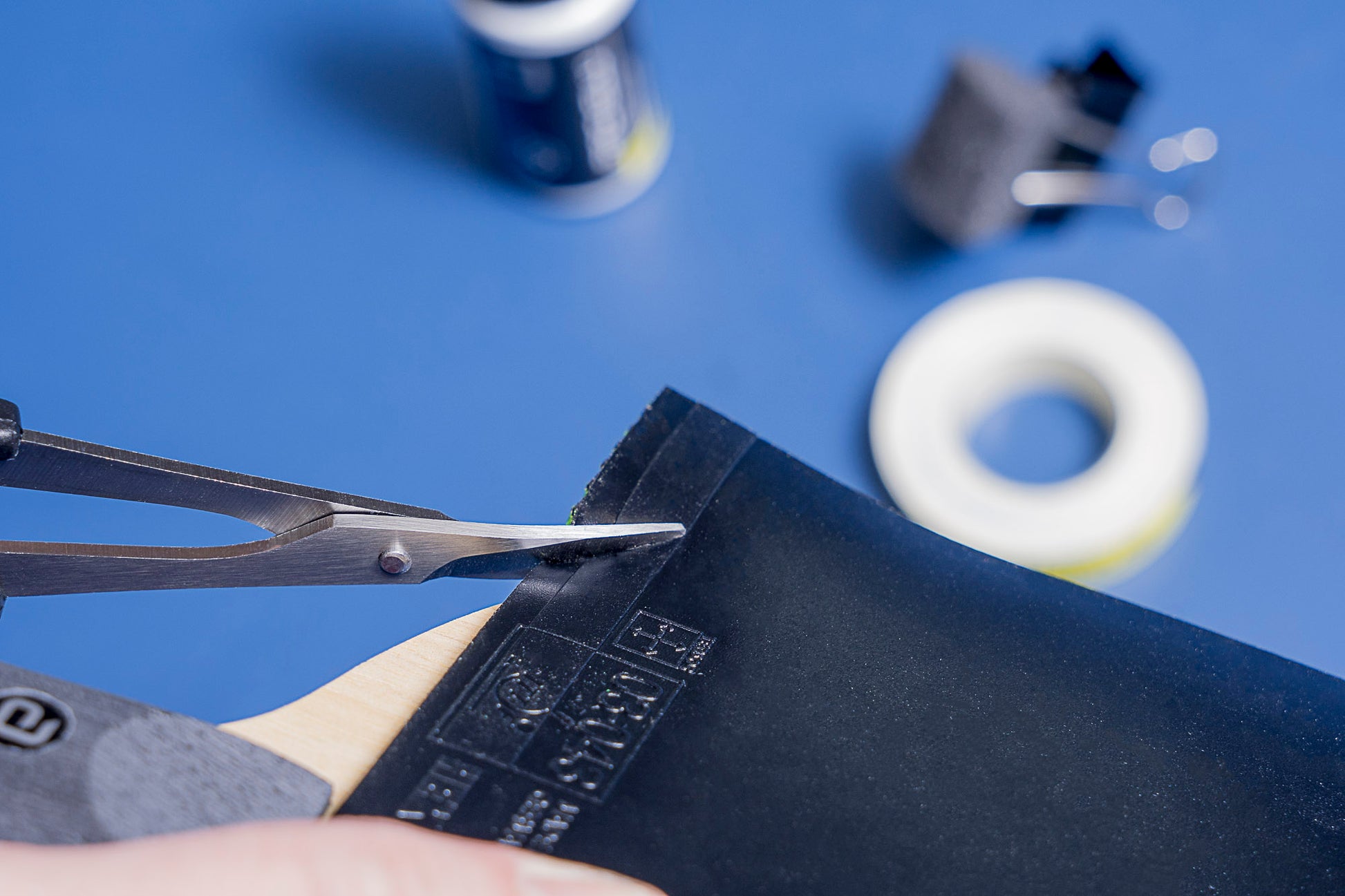Scissors specially developed for cutting table tennis rubbers. The short scissor blade allows precise, straight cuts on the table tennis surface along the edge of the bat. The curvature of the scissor blade should be aligned with the curve of the table tennis bat. This increases control over the cut and makes it easier to cut the rubber.